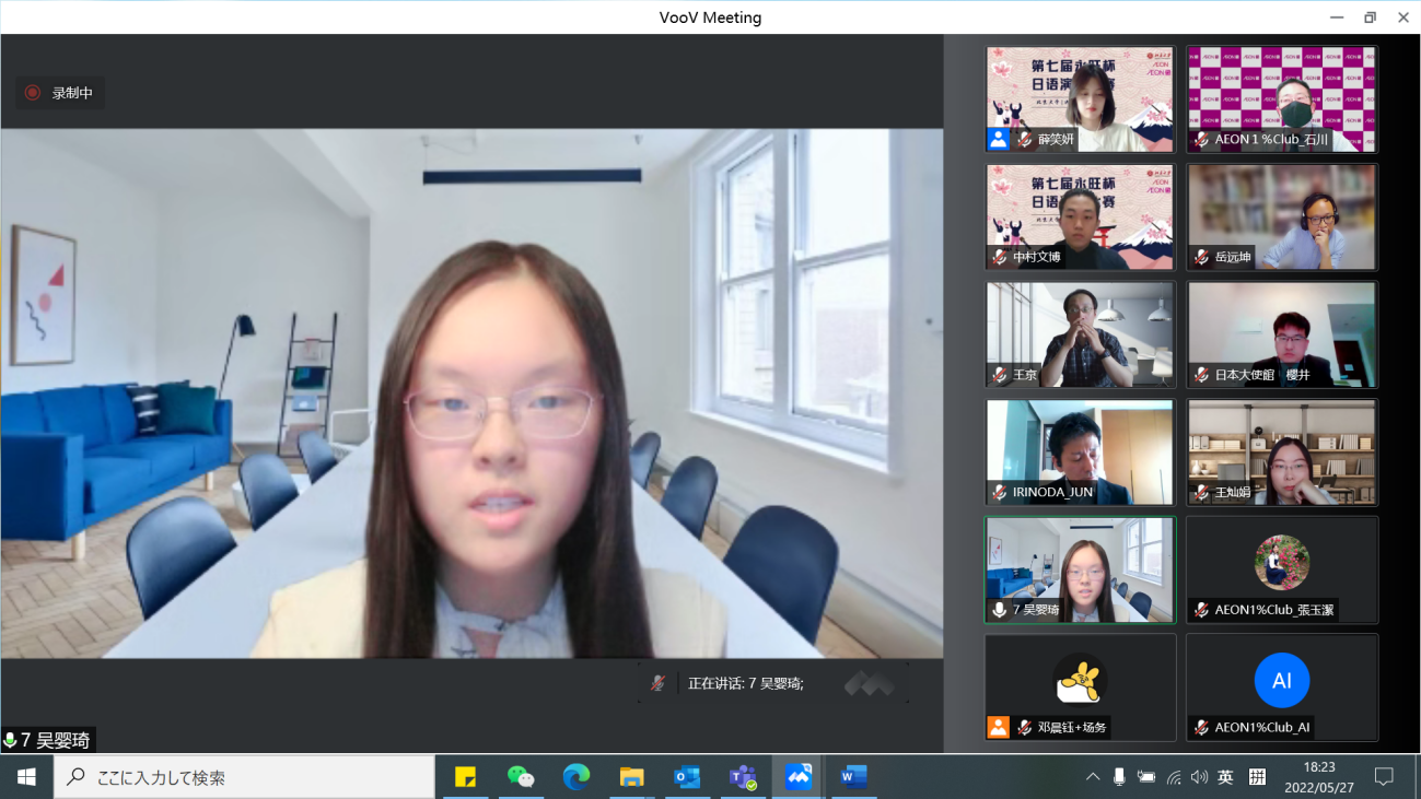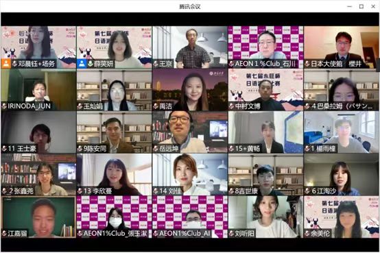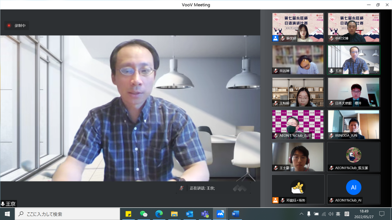 本届“永旺杯”采用线上会议的比赛模式,邀请校内外的日语专家们出席并担任嘉宾及评委。日本国驻华大使馆公关文化中心二等秘书樱井真一、公益财团法人永旺1%俱乐部事务局次长石川忠彦、永旺商业有限公司总经理入野田润、北京大学教育基金会项目管理部部长禹洁、B体育平台日本语言文化系副教授王京、助理教授岳远坤、王灿娟出席本次比赛。