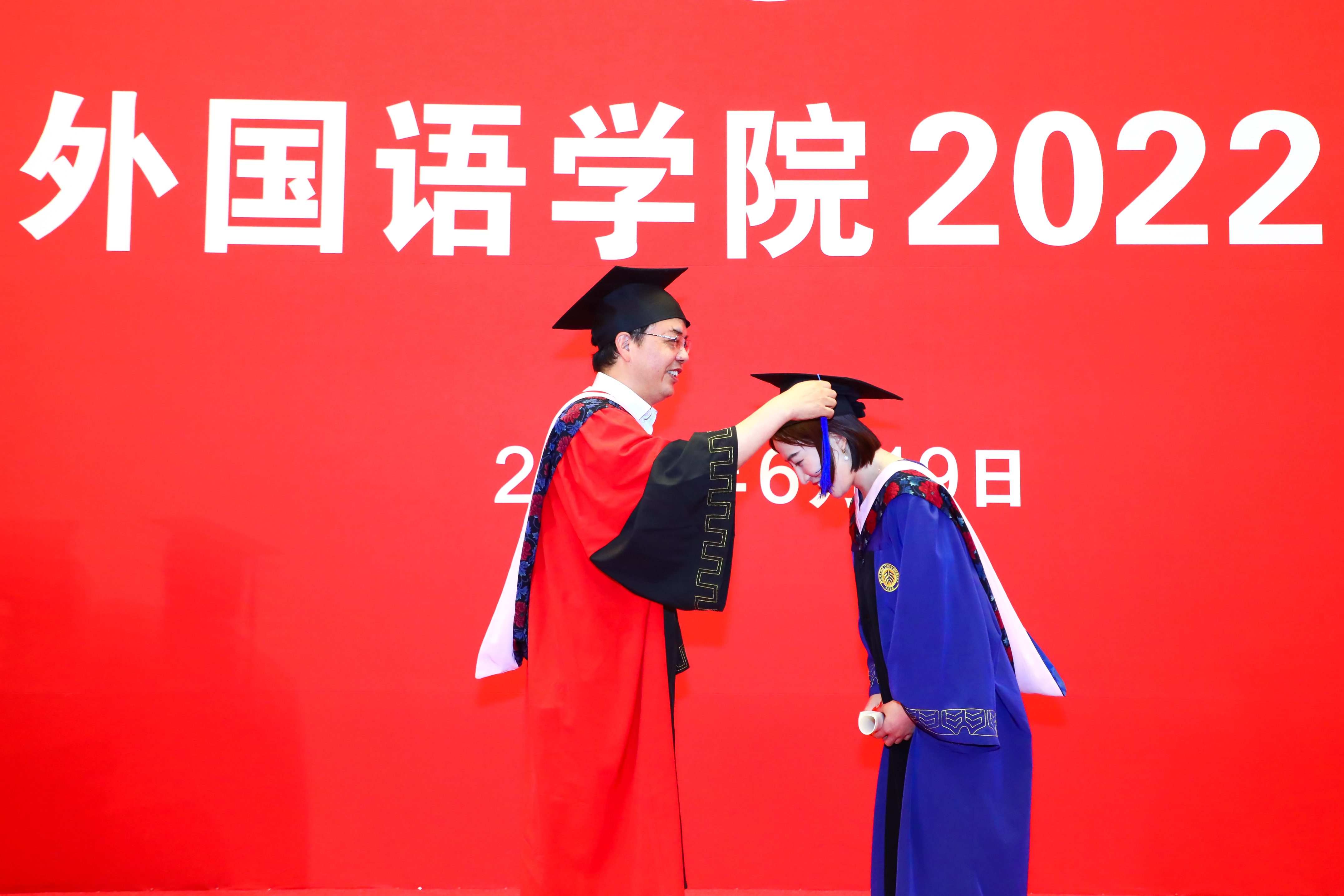 典礼的最后一项,也是最隆重的一项内容——拨穗礼。拨穗正冠,代表麦穗或稻穗的成熟,象征着同学们学有所成,可以展翅高飞,前往更加广阔的天地。院长陈明、党委书记李淑静、副院长王丹为同学们拨穗。