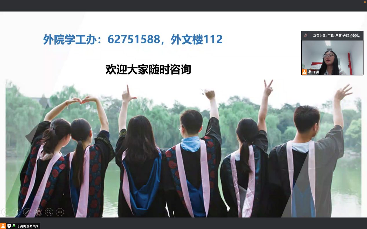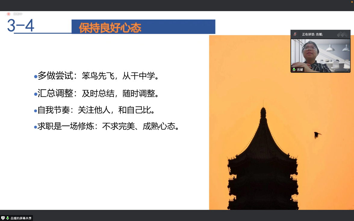 接下来,吕媛老师为同学们带来就业指导专题讲座。她从就业形势、就业政策和求职建议等方面与同学们进行了交流分享。吕媛用详细的数据向同学们讲解了疫情下的就业新形势,并向大家介绍了诸如北京落户新政等就业新政策,以及就业中心为大家提供的各种暖心服务。她提醒同学们充分了解政策,避开就业陷阱,从心态上减少焦虑,把握当下。