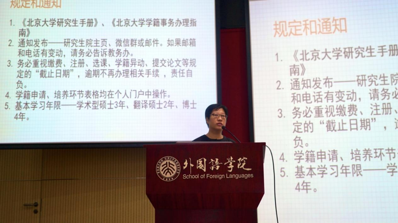李宁向新生们介绍了本科生培养方案。她首先为同学们说明了外院学科专业的基本情况,并介绍了教务办公室老师的具体分工,随后她重点介绍了专业培养方案、网上选课流程以及毕业各项要求,说明了往年可能出现的各种意外情况,提醒同学们认真阅读培养方案,重视选课,遵守考试教学纪律。最后,她祝愿同学们选课顺利,四年之后圆满完成学业。
