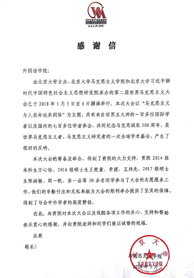 期间,B体育平台师生高度重视并支持此次盛会,积极投身语言翻译及志愿者招募工作,获得主办单位高度评价。据统计,2014级本科生方心怡、2016级硕士生王楚童、李媛、王炜先、2017级硕士生陈尚敏、周一帆、房一品等30余名同学参与了大会的志愿服务工作,他们的辛勤付出和无私奉献为大会的顺利举办提供了坚实的保障,得到了与会中外学者的高度赞扬。马克思主义学院特发来感谢信,对他们的支持和帮助表示衷心的感谢。
