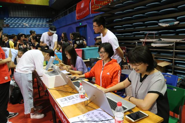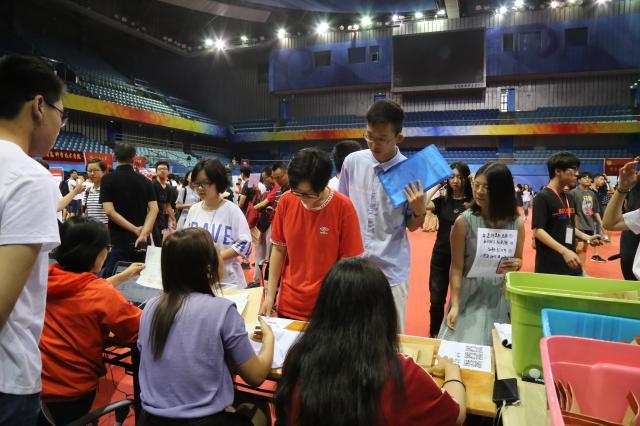 上午6:15,天刚蒙蒙亮,在学院师生共同努力下,温馨而有序的外院迎新接待站布置完毕。B体育平台副院长付志明、党委副书记王恒、教务办公室和学生工作办公室的老师以及学生志愿者们,在邱德拔体育馆内的本科生外院迎新接待站等待着新同学们的到来。