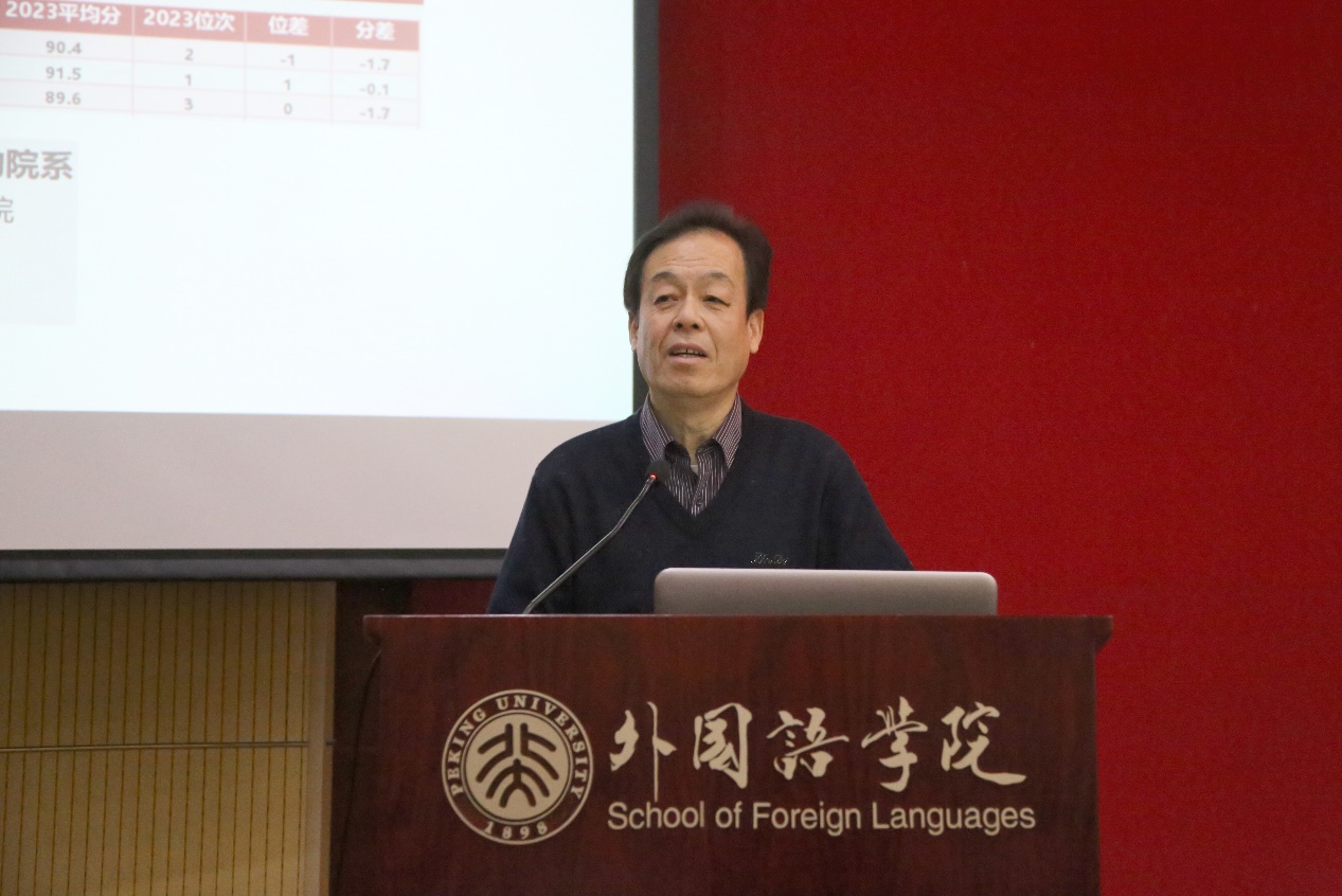 院长陈明作学院学科建设与人才工作汇报。2023年是“双一流”建设的中期评估之年,也是学校确定的“国际战略年”, 学院既坚持世界眼光、国际标准,又坚持中国特色、北大范式,重点考虑对国家和民族的贡献、对世界和人类的影响,继续保持国内顶尖、世界一流地位。全面融入国际协同创新体系,引领外语学科发展,服务国家和首都建设。在中国外交整体布局中推动北大的国际交流合作,教师获得多项国际荣誉,北大外语人的国际影响力持续提升。2023年,外院系统构建“引才、育才、选才”三位一体的人才队伍建设新机制,与学校战略同向同行,努力建设人才高地,多位教师获评高水平人才称号,队伍建设成效显著。