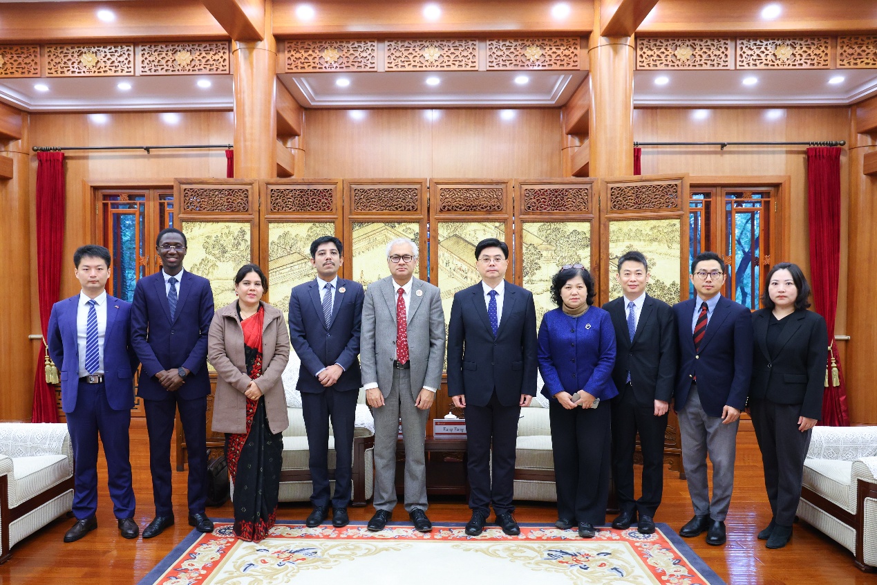2025年10月16日,孟加拉国外交学院局长伊克巴·艾哈迈德(Iqbal Ahmed)率孟加拉国外交部官员代表团访问北京大学。北京大学党委常委、副校长方方在临湖轩会见来宾。